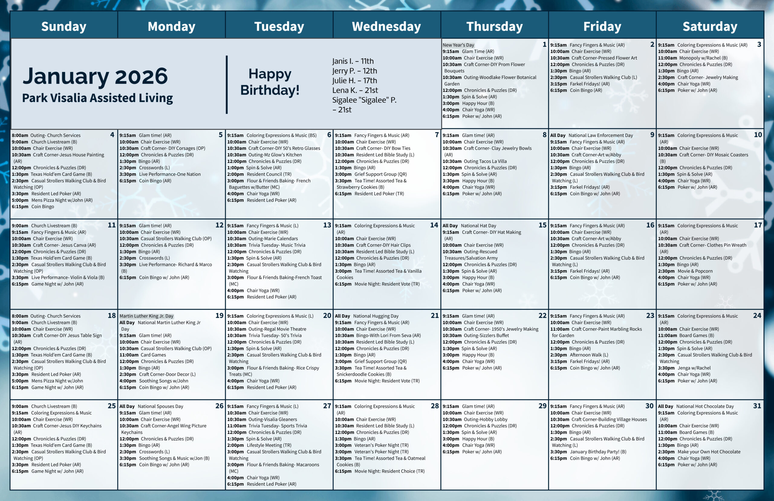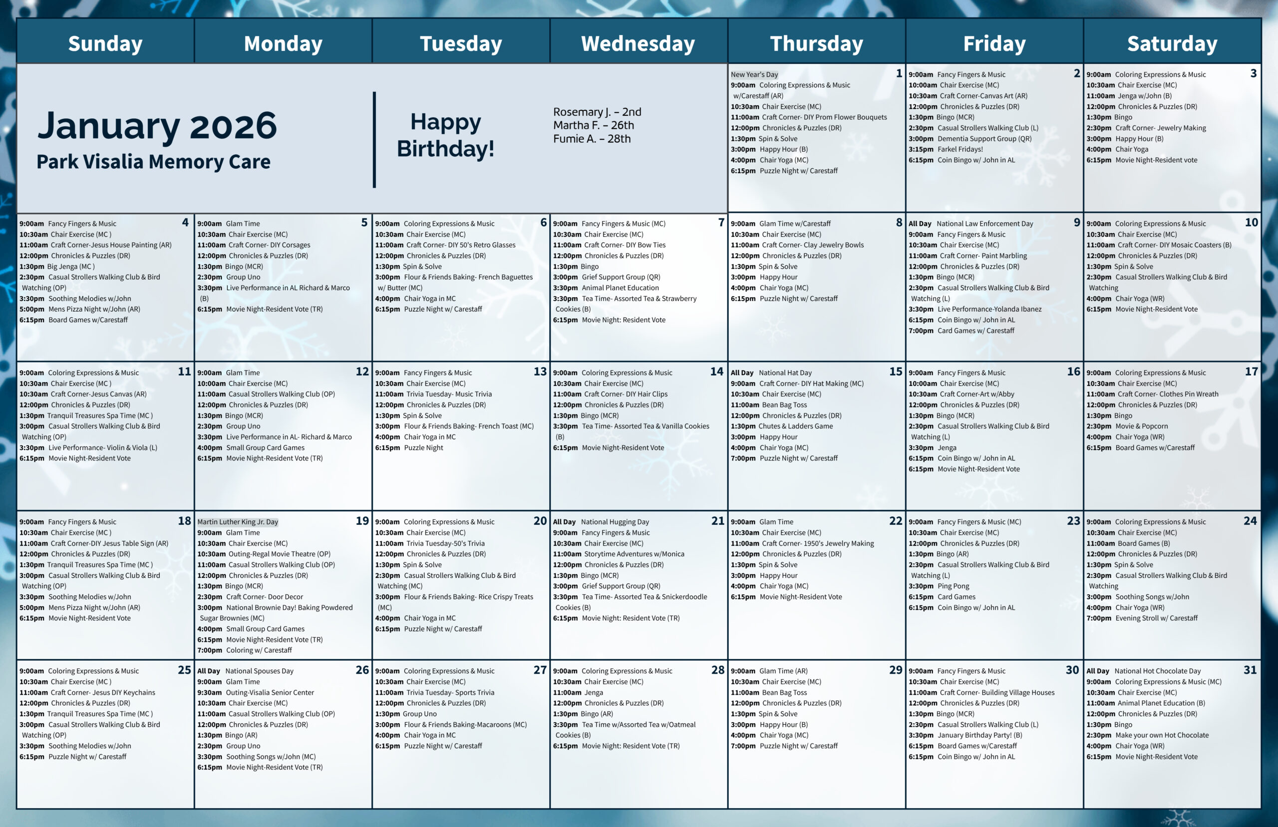The key to maintaining health and happiness is a resident driven active lifestyle full of physical, creative, spiritual and positive activities. Each of our communities features a packed activity calendar with a wide variety of programs, games, and artistic expressions that will have something for anyone and everyone to enjoy.